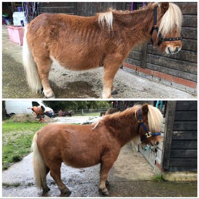 He was turned out in a paddock with his friend Rosie and bought in every night to a nice cosy bed, we were feeding three times a day along with constant access to hay! He gradually lost his pot belly and started to gain some weight, the photos on the right were taken 25 days apart.